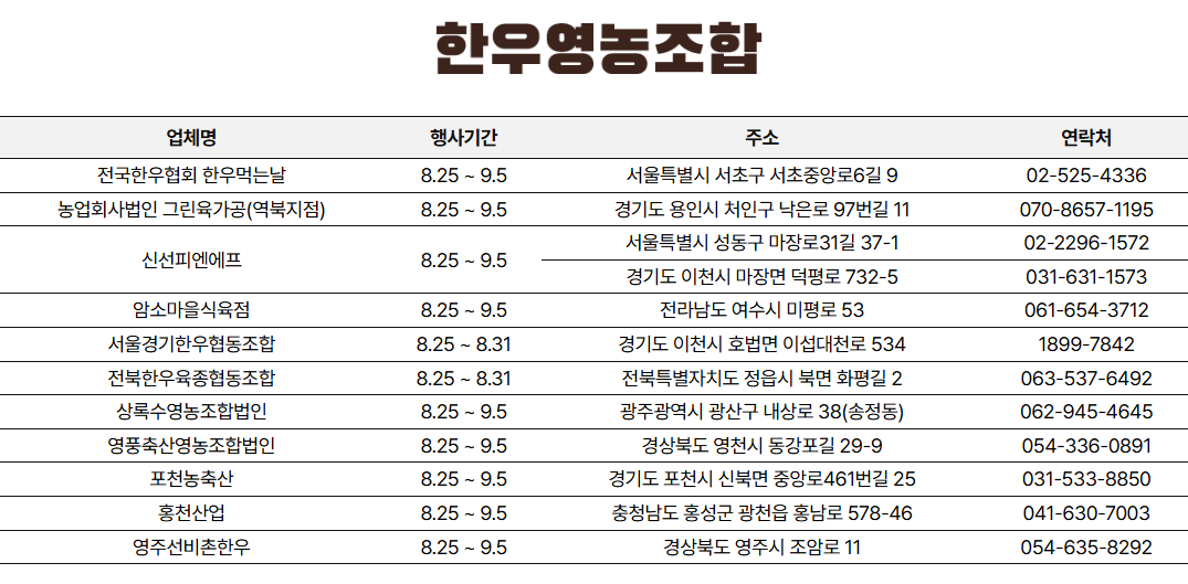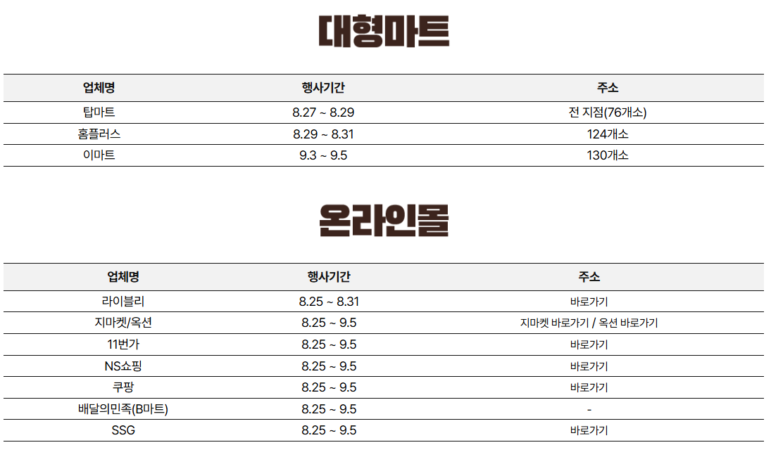 - 농협 하나로마트 및 주요 대형마트 : 8월 29일부터 행사 진행 중