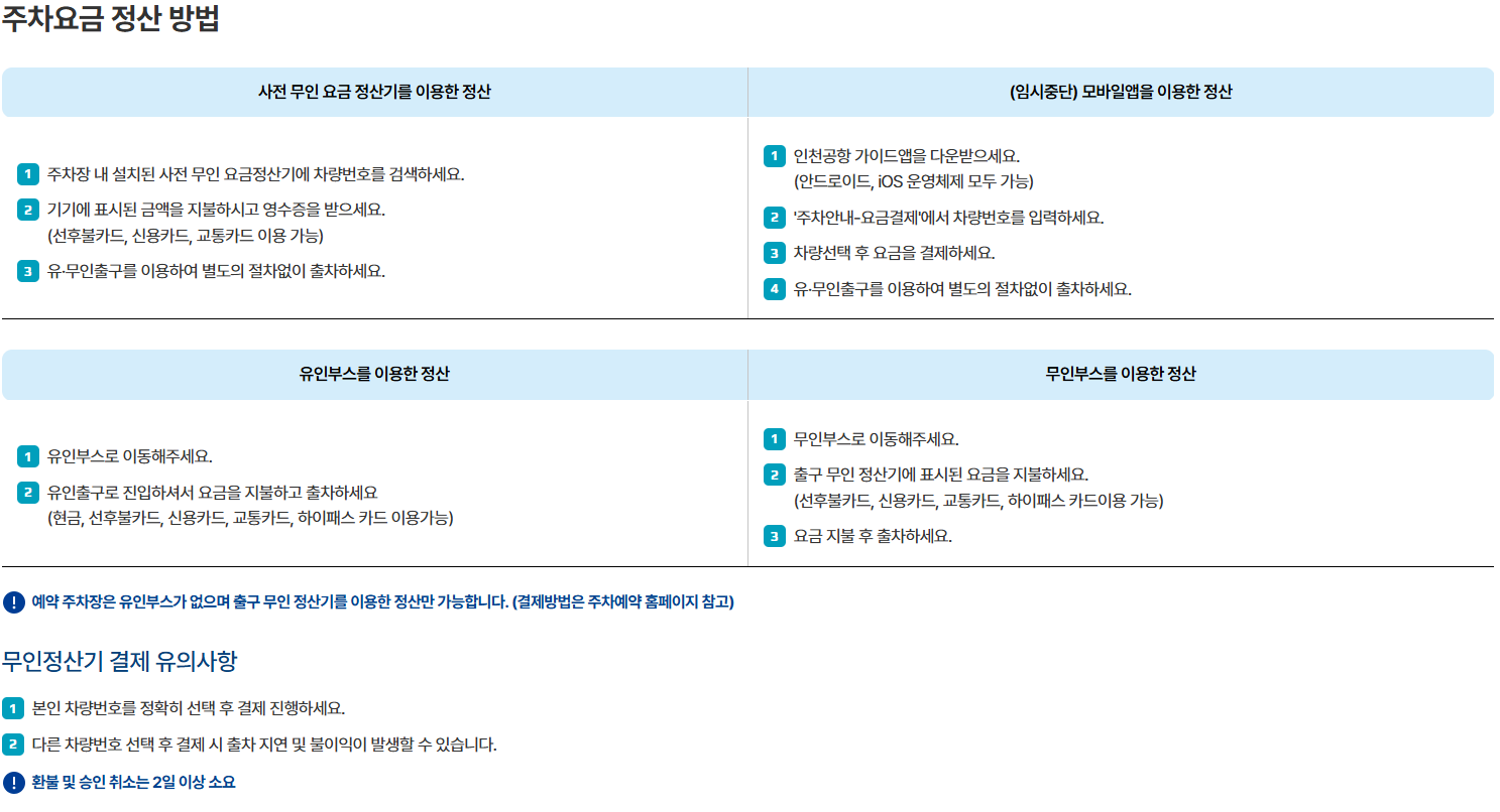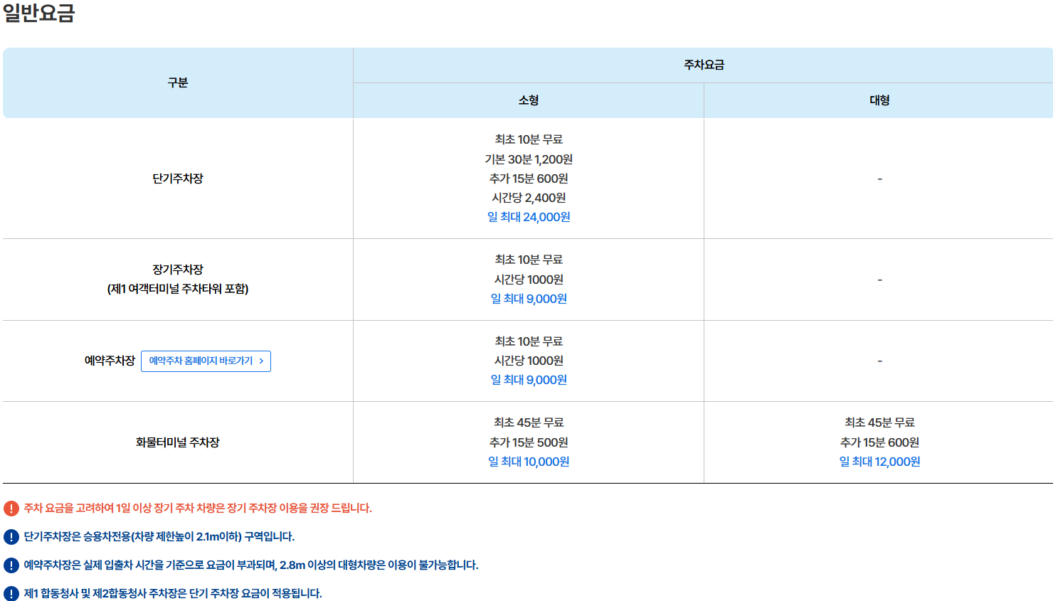 장기주차장의 하루 요금은 9,000원, 단기주차장은 24,000원 정도로, 공항버스 요금(1만6천~1만8천원)과 큰 차이가 없습니다. 이런 가격 구조는 ‘차라리 자가용이 편하다’는 생각을 키우고 있습니다. 주말이나 성수기 시즌에는 장기주차장은 물론 단기주차장까지 금세 만차가 항상 되곤 합니다. 그렇기에 인천공항을 이용하는 분들이라면 사전에 주차 관련 정보를 꼼꼼히 확인하고 대비하는 것이 필수입니다.